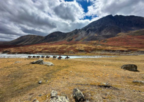 Après avoir traversé un pont en bois très rustique, nous traversons plusieurs rivières avant de randonner à travers les vallons parsemés de tourbières. Nous passons à proximité de la caserne des militaires de la frontière chinoise et campons à proximité du lac Khoton, depuis lequel nous aurons une vue sur des montagnes très arides contrastant avec le bord du lac sur lequel nous nous trouvons.
